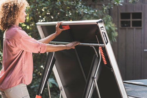 Miza 500X ima 16 zaklepnih točk. Zato ostane popolnoma na svojem mestu, tako v času igranja kot tudi v položaju za shranjevanje. Ta patentiran sistem zagotavlja prvovrstno raven varnosti. Mizo je preprosto zložiti ali odpreti s svojim enostavno dostopnim ročajem (DSI) , ki ima pri mizi 500X vgrajeno dodatno varnostno funkcijo - blokira se pod kotom 65 stopinj, če ročaja ne držite več, medtem ko se miza odpira.