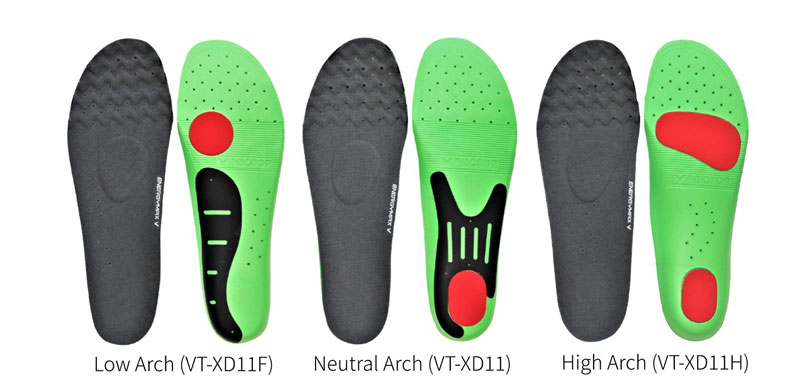 Vse tri vrste vložkov so opremljene s podplati s prečnim lokom (dvignjen del na sredini črne strani, kot je prikazano zgoraj) in zasnovane z različnimi podpornimi višinami in površinami, ki temeljijo na različnih stopalnih lokih. Podplat s prečnim lokom tudi pomaga prečnemu loku ohraniti svojo obliko, preprečuje, da bi se prsti razširili, in ohranja velikost podplata, zaradi česar je gibanje stopala bolj naravno.